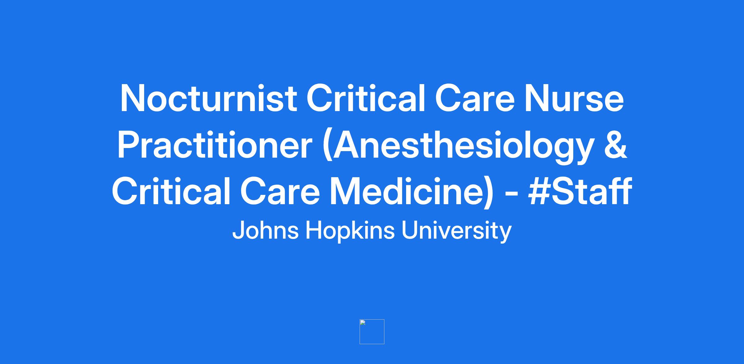 We are seeking a **_Nocturnist Critical Care Nurse Practitioner_** at the Johns Hopkins University School of Medicine, working as an independent clinician within a team setting, providing ICU-level care to patients in the Neuro Critical Care Unit with a medical staff appointment at the Johns Hopkins Bayview Hospital, **_working 100% nights_** . The Nocturnist, consistent with the area of practice and privileges, will be responsible during the night shift for providing ICU-level care to Neuro patients.