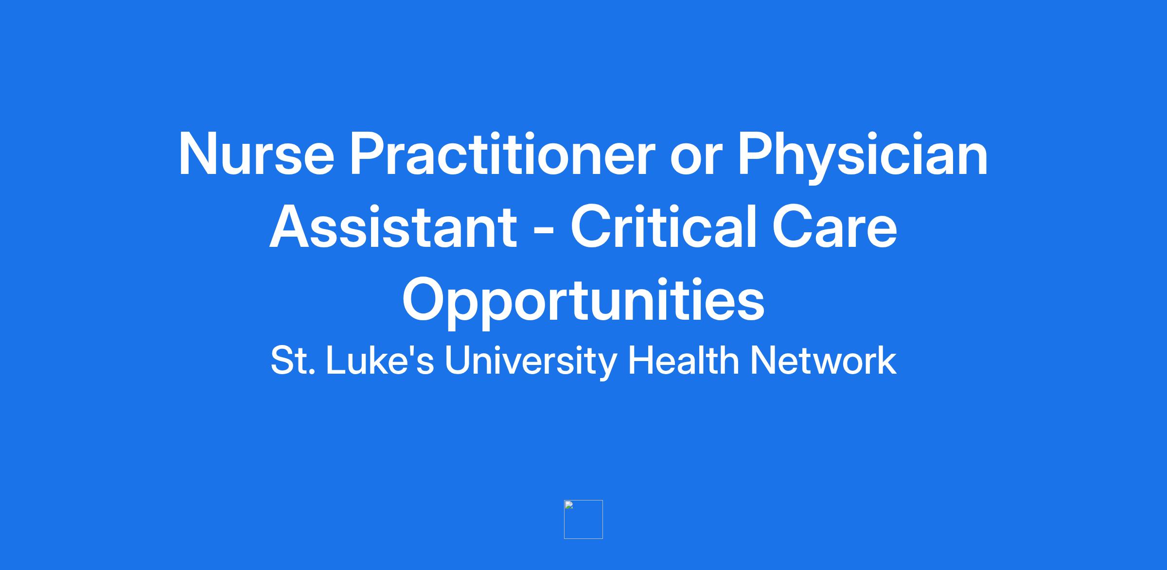 As our health network expands, our CCAP team continues to grow creating multifaceted opportunities within our department and the Network. We have 9 Campuses that provide Critical Care Services to our communities and allow for a diverse Critical Care Population and endless growth opportunities. As a member of the Critical Care Team, you are highly respected, and vital to St. Luke’s mission of providing affordable, high-quality care. As an Advanced Practitioner Provider, you will have the opportunity to practice medicine to your fullest potential in a multidisciplinary, collaborative model with excellent team dynamics. Submit your application today, and a recruiter will personally connect with you to discuss a current opportunities available at our campuses!