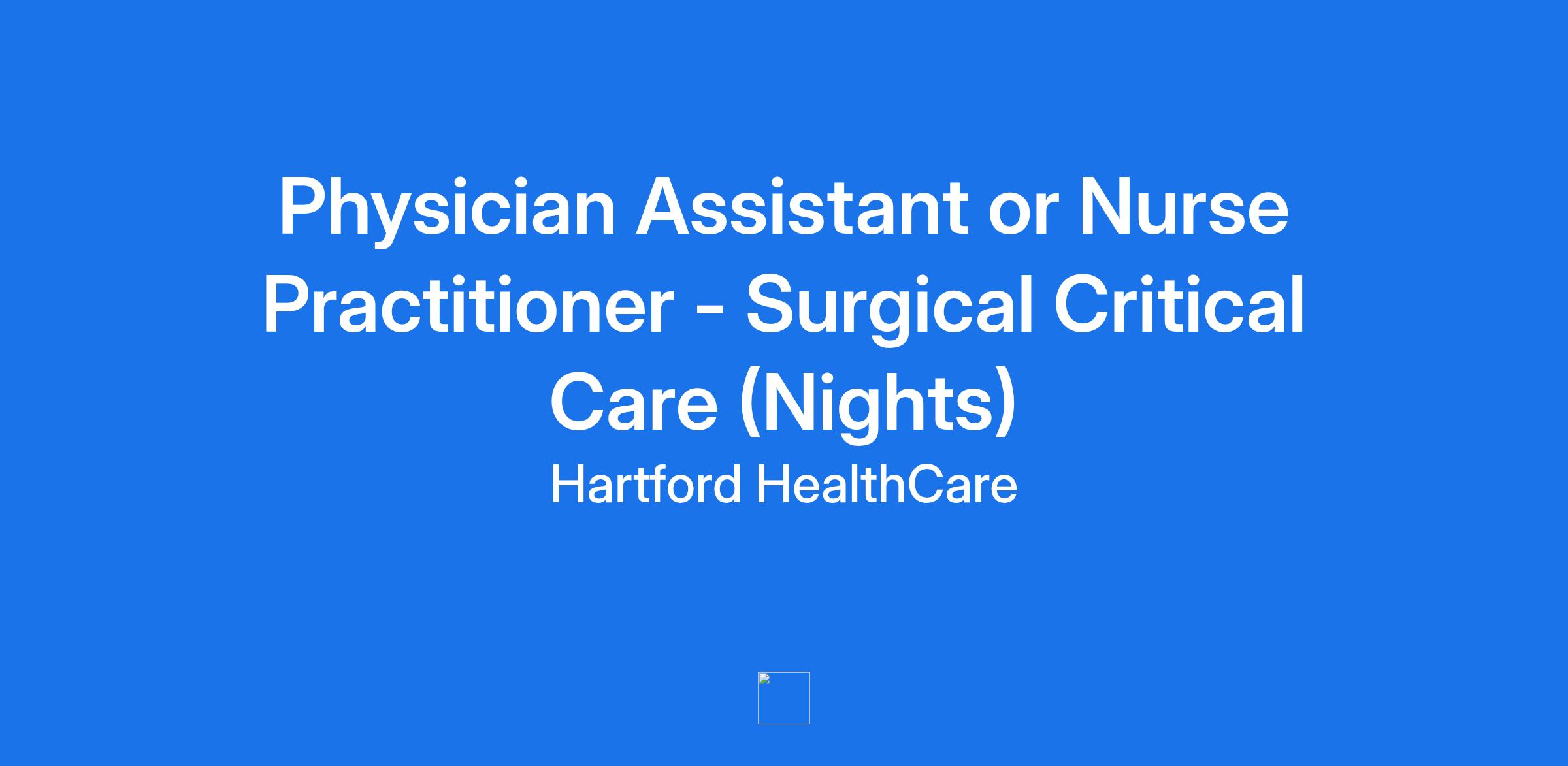 *Advanced Practitioner Benefits:* * *Market-leading* compensation and benefits and generous paid time off * Paid CME time off plus CME budget, reimbursed professional licenses and dues * Enhanced *Tuition Assistance* and Higher Education Partnerships * Voluntary benefits include student loan programs, home, auto, renters insurance, identity theft protection, legal services, pet insurance and more! * Employee *discount programs* and colleague assistance programs offering resources and information for personal and work-life issues * Family care benefits through _Care.com_ including *emergency back-up care benefit* for children, adults and even pets! *Position Details:* Hartford Hospital is seeking a Physician Assistant or Nurse Practitioner to join their Surgical Critical Care team! The Advanced Practice Providers (APPs) are an essential part of the multidisciplinary team that plans and delivers care for complex surgical and trauma patients in the ICU. The patient population includes complex trauma, transplant, vascular, general surgery, neurosurgery, interventional radiology and other critical care patients as the service needs dictate. * * *Role*: Open to Physician Assistants or Acute Care Nurse Practitioners *Location*: 79 Jefferson Street, Hartford, 06102 *Setting*: Inpatient, Critical Care, Surgery *Schedule:* Permanent nights 27hrs day/night rotating, including weekends and holidays.*Premium differentials offered*. *Call schedule: *No call *Hartford HealthCare supports Nurse Practitioners and Physician Assistants in practice:* · Dedicated support and voice for our for Nurse Practitioners and Physician Assistants through the *Office of Advanced Practice* directed by Sarah Clark, MBA, MHS, PA-C, BSN, RN, System Director of Advanced Practice · Hartford HealthCare is one of the largest, *non-profit*, fully-integrated healthcare systems providing patient care in the state, allowing our providers to care for their patients no matter where they reside in Connecticut · With tools like *EPIC*, Hartford HealthCare’s state of the art clinical and informatics technology promotes improved patient outcomes, streamlined continuity of care and superior provider satisfaction *Nurse Practitioner and Physician Assistants Role Scope:* Under established guidelines and in collaboration and/or supervision with the practice physician(s), Advanced Practitioners perform routine physical examinations, and formulate medical, educational, and psychosocial plans to treat patients. In consultation with the physician(s) and care team members, Advanced Practitioners develop plans for further evaluation of health needs, e.g., referral to other health team members or specialists. Advanced Practitioners provide appropriate treatment for problems within the scope of the provider’s practice as designated by protocols and identifies problems outside of their scope of practice and refers appropriately to physician. *About Hartford Hospital:* *Hartford Hospital is one of the largest and most respected teaching hospitals in New England*. The Hospital is a Level 1 Trauma Center which provides *cutting edge treatment* to its patients. This is made possible by being home to the *largest robotic surgery center in the Northeast* and the Center for Education, Simulation and Innovation (CESI), one of the *most-advanced medical simulation training centers in the world*. When hospitals cannot provide the advanced care, expertise, and new treatment options their patients require, they turn to Hartford Hospital. *About Hartford HealthCare:* · Honored as a “*Best Organizations for Leadership Development*” by the National Center for Healthcare Leadership (NCHL) · Prestigiously named one of the “*Best Hospitals to Work for in Connecticut*” by the Becker's Hospital Review · Committed to *continuous development* through The Center for Education Stimulation & Innovation (CESI), our Provider Leadership Development Institute and a robust on demand learning platform including CME, special courses, learning series and tools and resources · Established *Mentorship and Orientation* programs specially designed for newly hired providers and providers new to practice *Requirements:* * *Licensure*: Unrestricted State of Connecticut Medical License (or eligible) * *Training*: Certified or board-eligible Physician Assistant or Acute Care Nurse Practitioner * *Minimum of 1-2 years*of recent critical care experience as an Advanced Practice Provider in an ICU setting. * *Proven*ability to independently manage ICU patients, including proficiency in ventilator management, resuscitation, and performing critical care procedures within the APP scope of practice. * *Comfortable*working independently in a night shift environment. Interested candidates please contact Victor Rodriguez, Advanced Practice Recruiter, at Victor.Rodriguez2@hhchealth.org or (959) 261-7619. */As an Equal Opportunity Employer/Affirmative Action employer, the organization will not discriminate in its employment practices due to an applicant’s race, color, religion, sex, sexual orientation, gender identity, national origin, and veteran or disability status./* **Job:** **Critical Care* **Organization:** **Hartford Hospital* **Title:** *Physician Assistant or Nurse Practitioner - Surgical Critical Care (Nights)* **Location:** *Connecticut-Hartford-79 Jefferson St HH Bliss Wing (10064)* **Requisition ID:** *24165808*